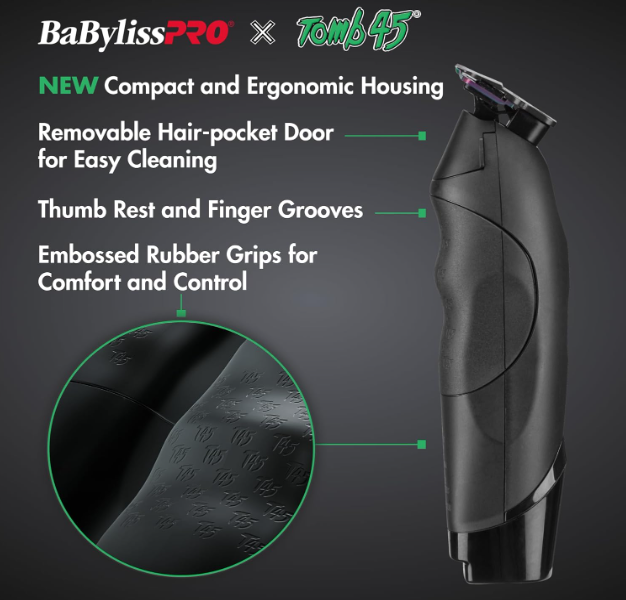 La recortadora BaBylissPRO x Tomb45 está diseñada para precisión y potencia, diseñada por barberos, para barberos. Cuenta con una hoja en T MIM de dientes profundos con una temperatura más baja de la cuchilla, un depósito de aceite incorporado y ajuste de espacio cero. Alimentado por el motor DS1 de doble velocidad y una batería de iones de litio de alta capacidad, ofrece hasta 3 horas de tiempo de funcionamiento. Con una orientación de hoja invertida para alineaciones nítidas, compatibilidad de carga inalámbrica y carga USB-C, está diseñado para un rendimiento de nivel profesional.